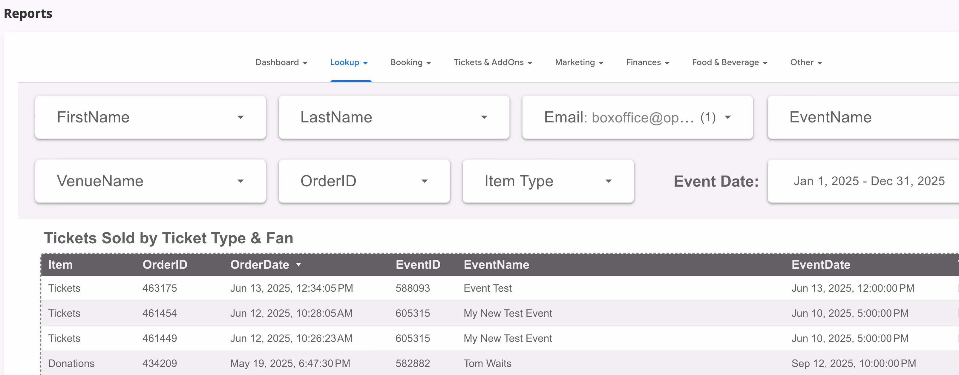 New Report: Customer Lookup We’ve made it easier than ever to support your customers. You can now search by name, email, event, or venue to quickly find the customer you need. Once selected, you’ll see a full purchase history, including tickets and donations—all in one place.