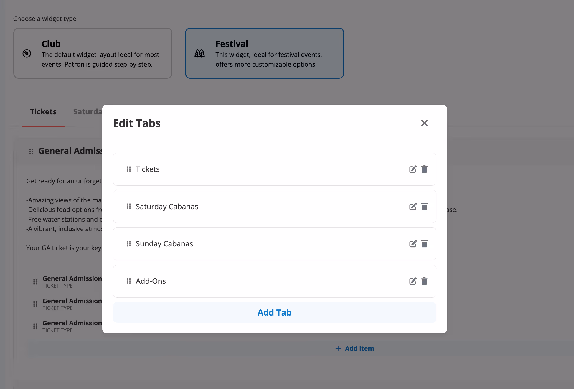 Now, you can organize your offerings into tabs and groups for a cleaner, more intuitive checkout experience—especially useful for complex events with multiple options. Whether you're selling VIP packages, early entry tickets, or merch add-ons, you can keep everything neatly structured and easy for customers to navigate.